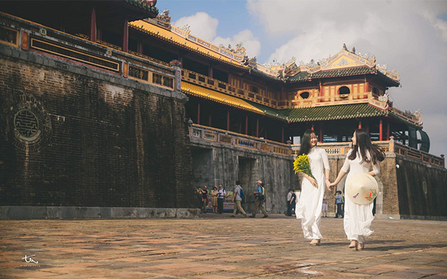 Vietnamese girls wearing “Ao Dai” – Vietnamese traditional costume and taking photos in front of Imperial City of Hue (Source: Tu Photographers)