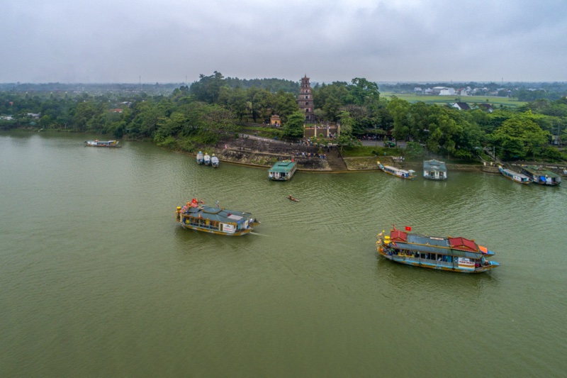 Aerial view of festival Hon Chen temple on Huong river, Hue