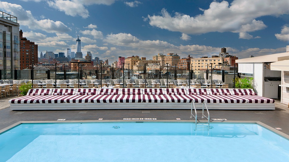 The rooftop of the Soho House New York, which houses a luxury hotel and private club, has spectacular views towards downtown Manhattan and the Hudson River. The heated swimming pool is open year-round, while food and drinks are served at the loungers and tables all day during summer months. The Soho House New York is situated right smack in the center of city’s trendiest neighborhood, the Meatpacking District.