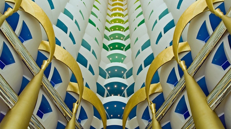 The distinctive silhouette of Burj Al Arab Jumeirah, a glittering architectural marvel in the middle of the Arabian Gulf, is more than just a stunning hotel – it is a symbol of modern Dubai. Despite its enormous size, the Jumeirah managed hotel holds only 28 double-story floors which accommodate 202 lavish bedroom suites. It is built to resemble the sail of a dhow, a type of Arabian vessel. Two “wings” spread in a V to form a vast “mast”, while the space between them is enclosed in the massive, 180 m (590 ft) tall lobby. The latter features a central fountain and a cascading waterfall with columns embellished with 24-karat gold leaf.